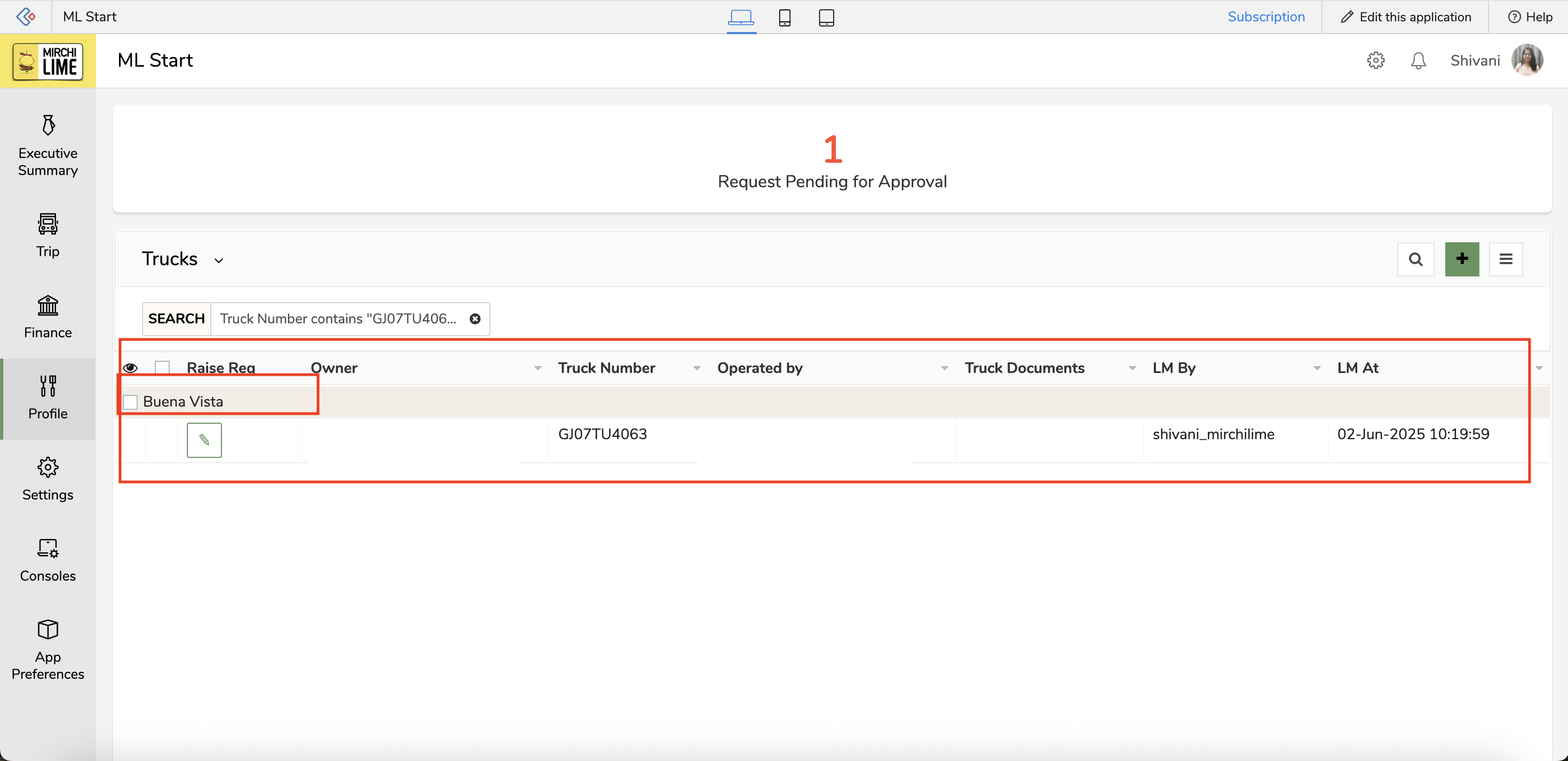 Step 1: Navigate to Profile → Trucks and search for the truck.